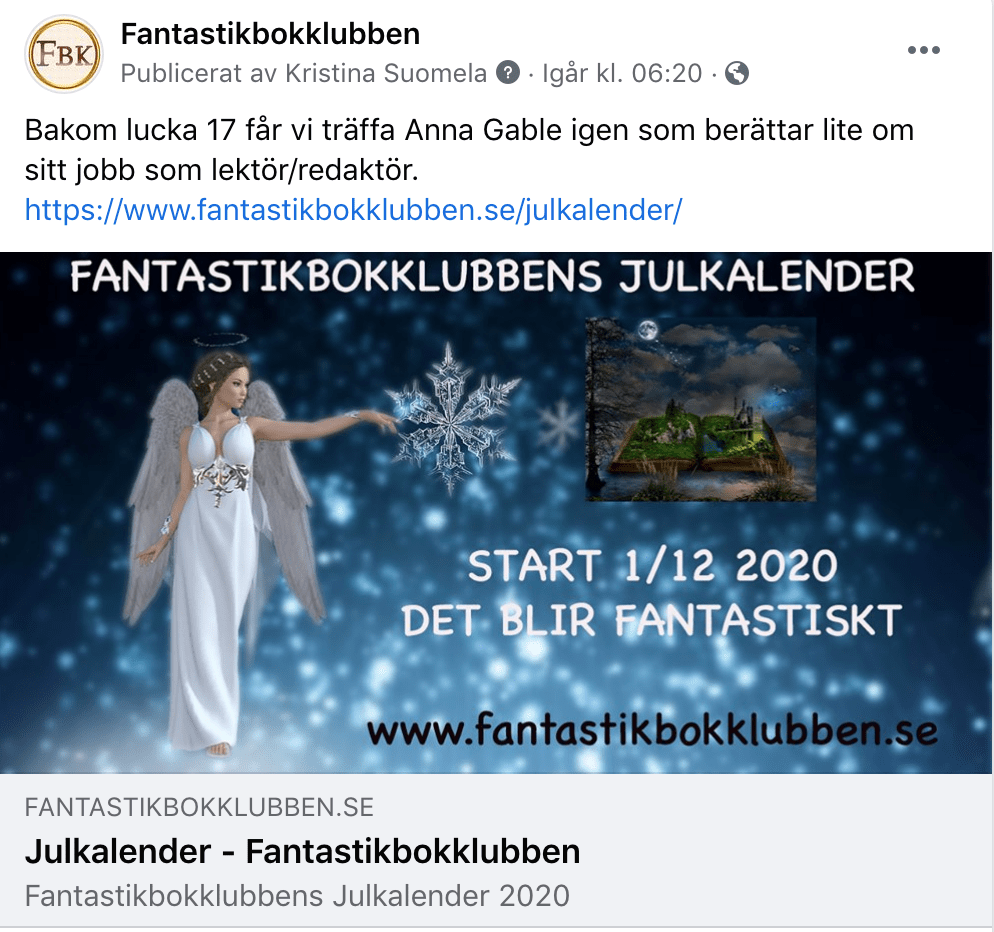 I min roll som lektör var jag gäst i Fantastikbokklubbens adventskalender i går. Här kan du läsa inlägget och ta del av mina 24 tips mot skrivkramp.