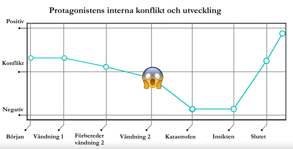Så långt stämmer det men något saknas, nämligen den interna konflikten hos protagonisten. Annars blir det för mycket fokus på plotten på bekostnad av karaktärerna. Den vändning som sker i manusets mitt är i första hand till för protagonisten, inte för läsaren.
