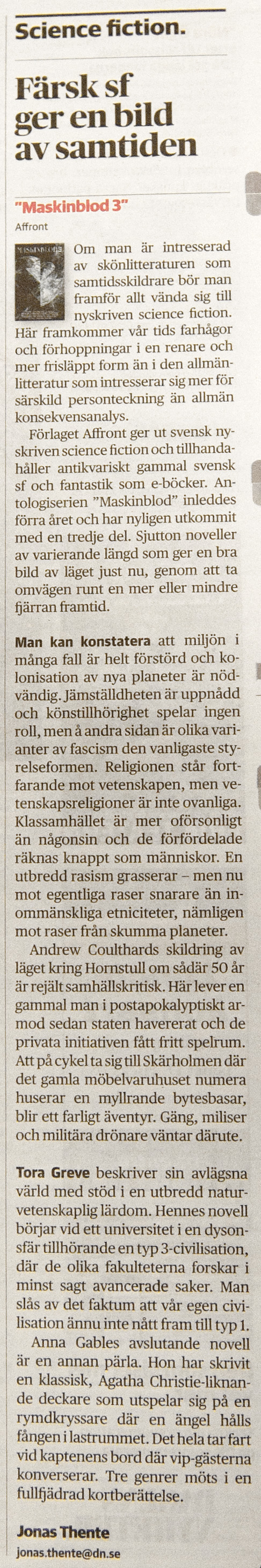 ”Anna Gables avslutande novell är en annan pärla. Hon har skrivit en klassisk, Agatha Christie-liknande deckare som utspelar sig på en rymdkryssare där en ängel hålls fången i lastrummet. Det hela tar fart vid kaptenens bord där vip-gästerna konverserar. Tre genrer möts i en fullfjädrad kortberättelse.”
